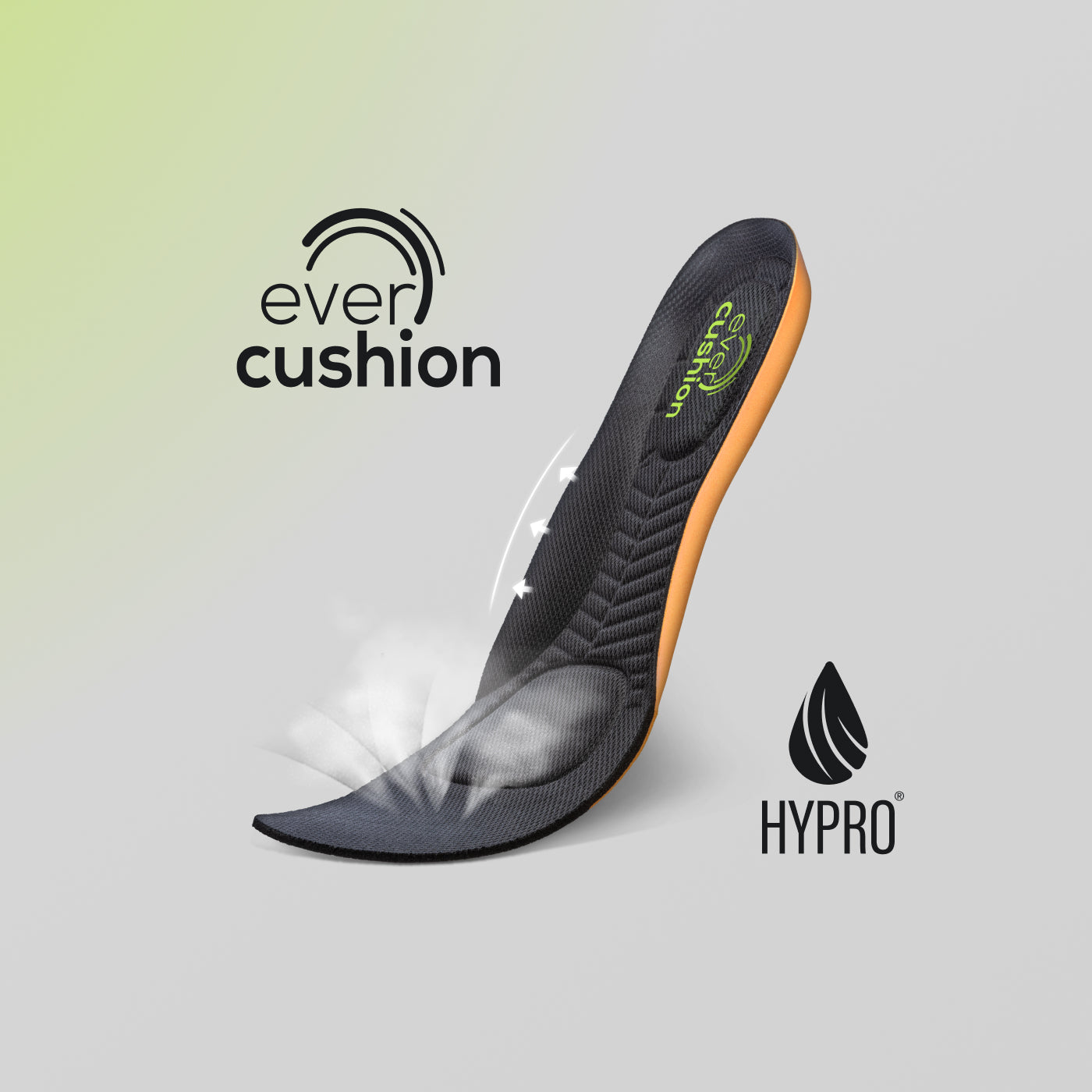 Alle Scuff Caps EVO modellerne finder man Evercushion CUSTOM FIT MID indlægssålen som består af polyurethane skumceller der transporterer fugt væk fra foden, og sikrer i kombination med fugtabsorberende og antibakteriel behandlet stof, et behageligt klima for foden. Sålen yder permanent dæmpning, uden at miste elasticitet, og forlænger samtidig skoens levetid.