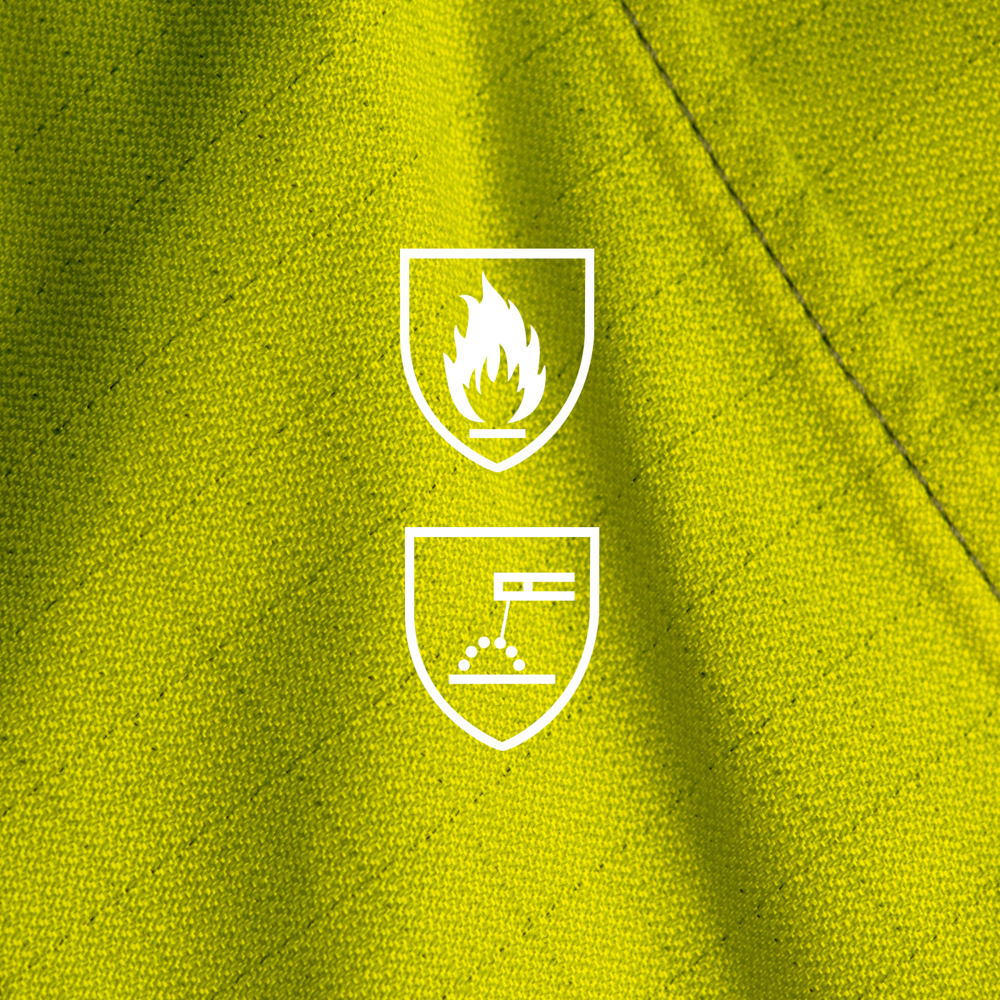 Den polyesterfri beklædning, er i overensstemmelse med EN ISO 11612 A2 (kant antænding), og overfladen forbliver intakt hvis det kommer i kontakt med metalstænk, hvis du lejlighedsvis har brug for at svejse mens du er iført din skalbeklædning.